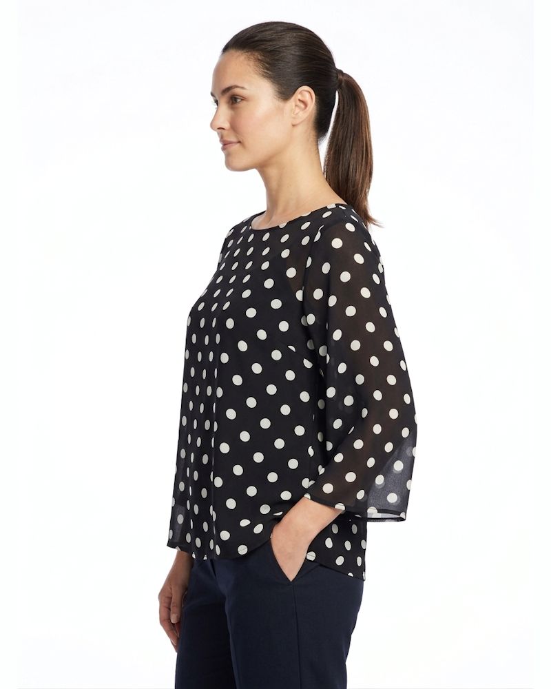 This smart blouse features 3/4 length sleeves with turn-up detailing and decorative buttons on the cuffs. It is finished with a classic round neckline.